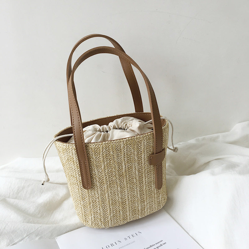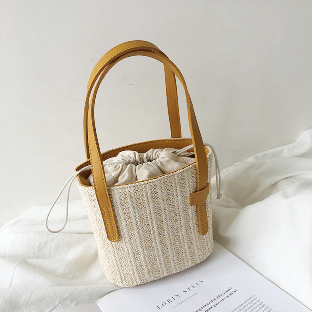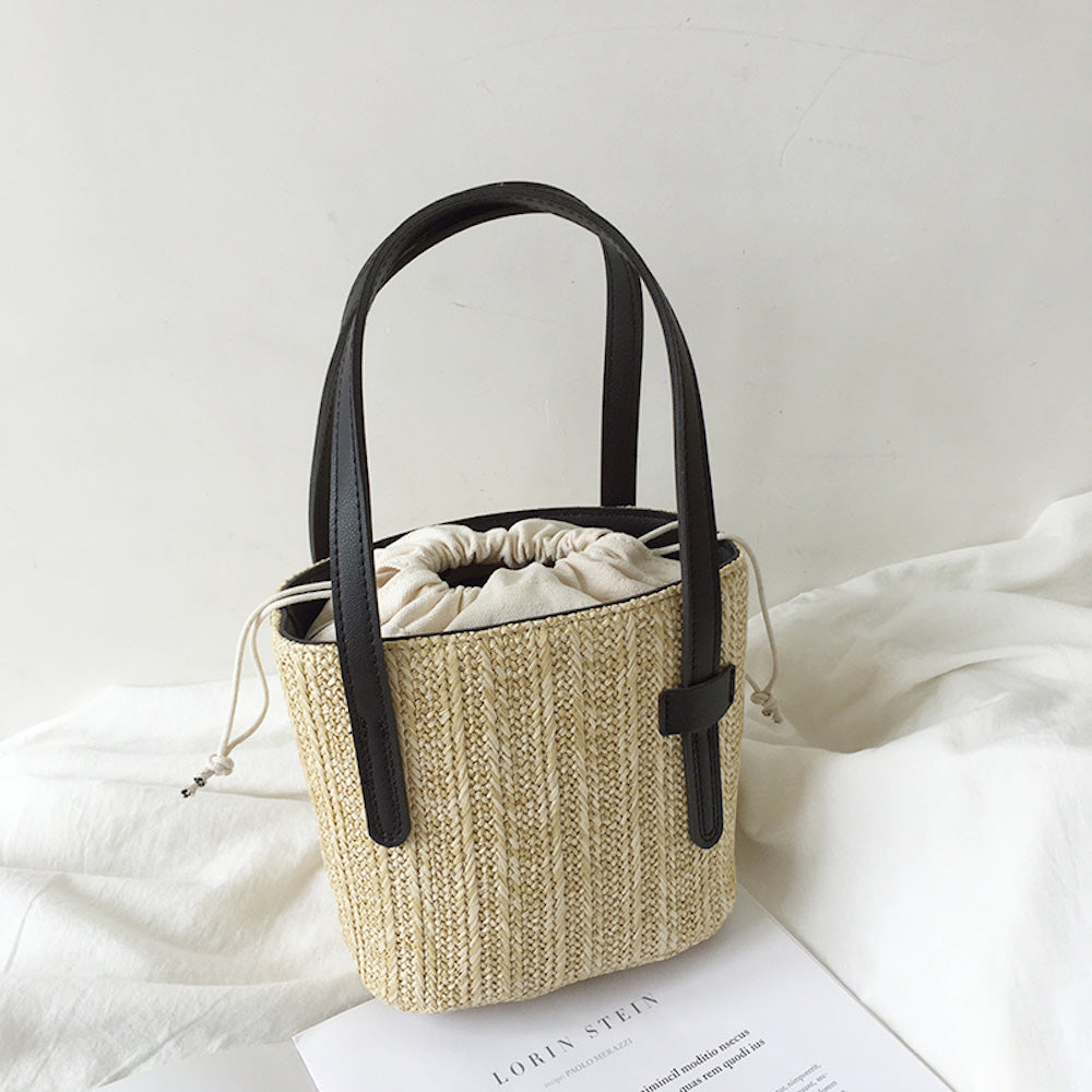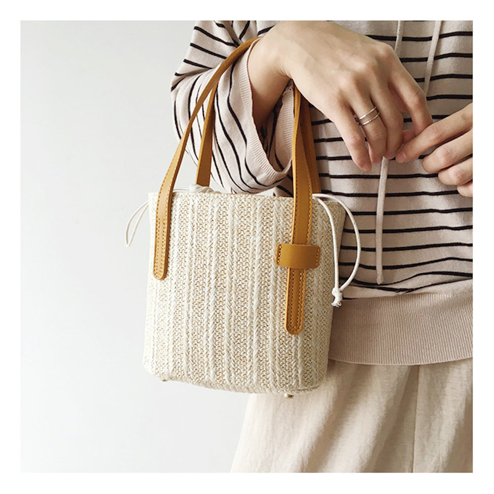 Leather and Straw Bucket Bag, Summer Handbag, ins Style Purse