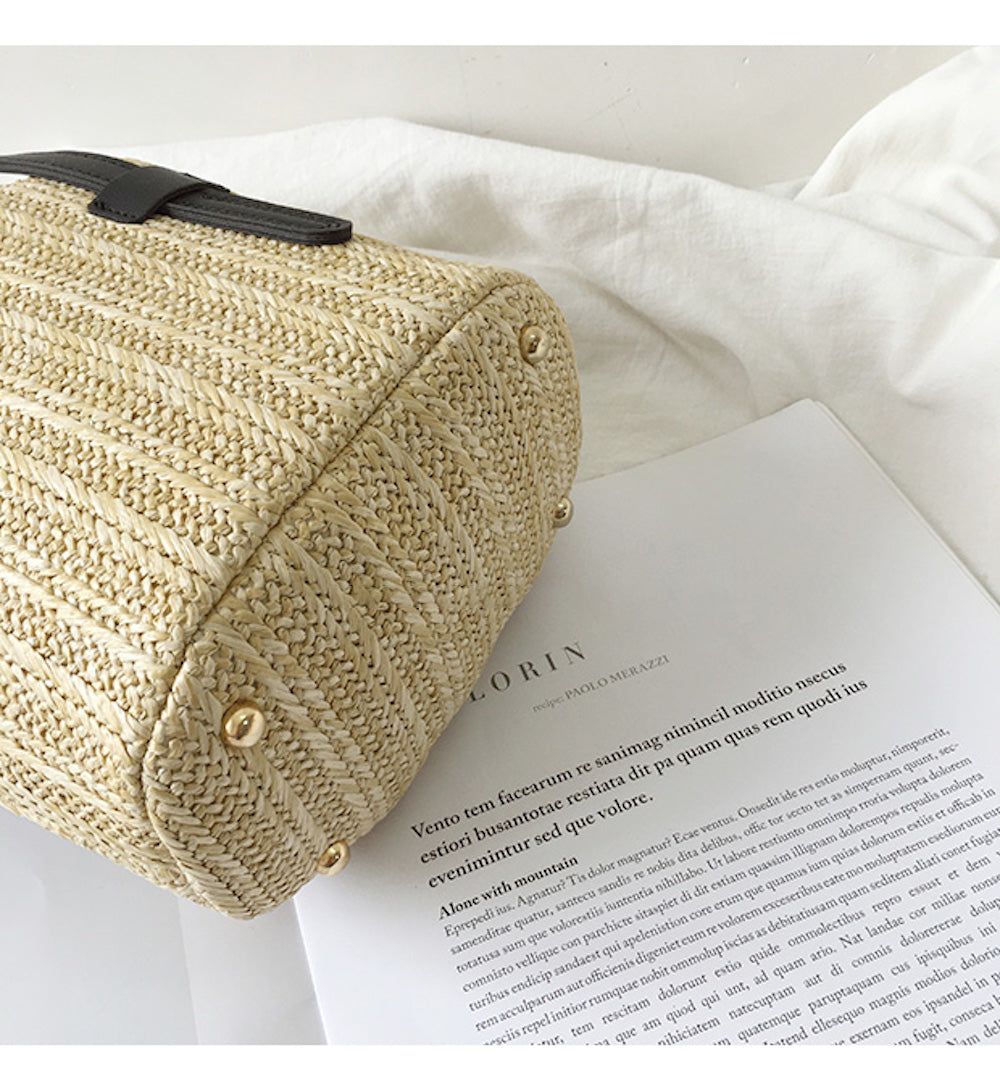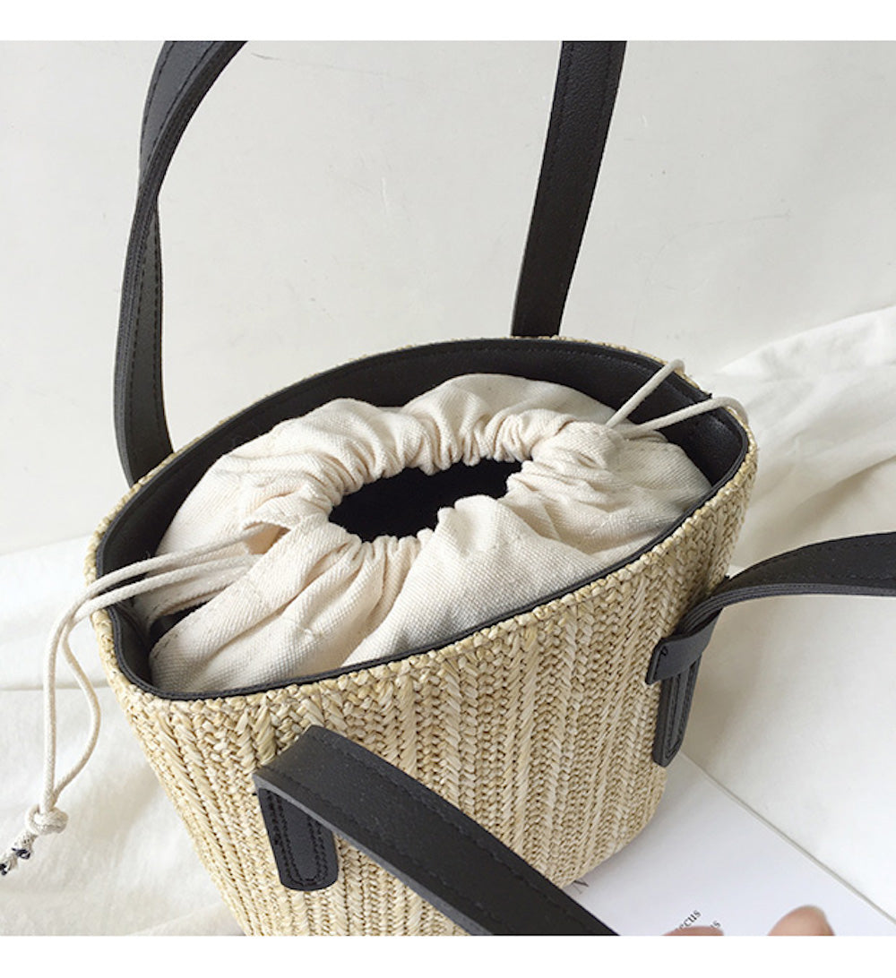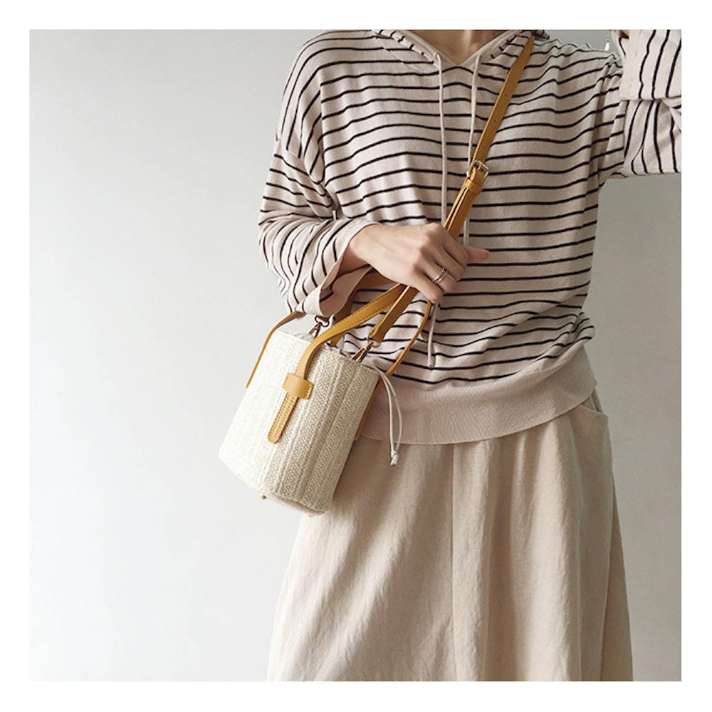 Leather and Straw Bucket Bag, Summer Handbag, ins Style Purse