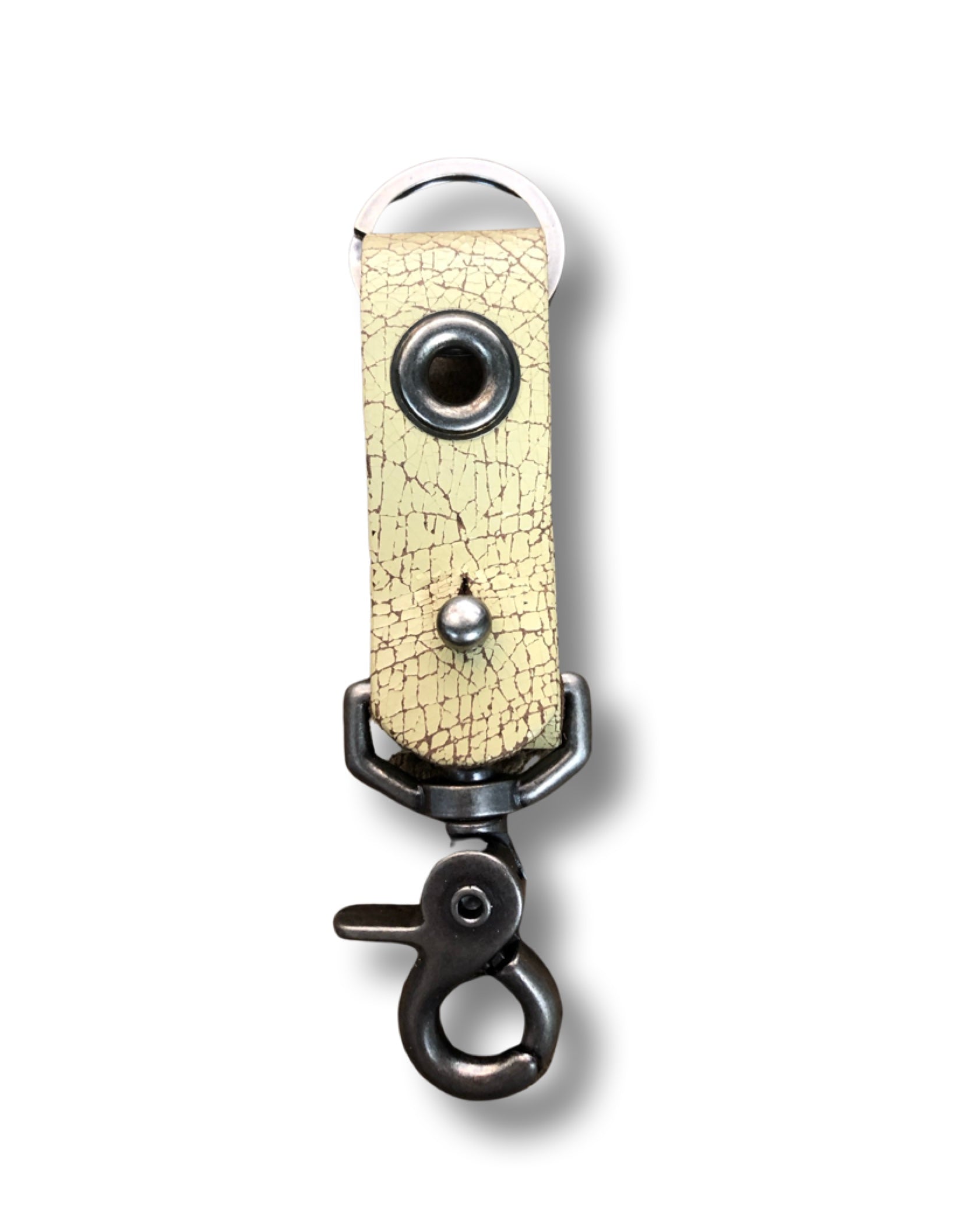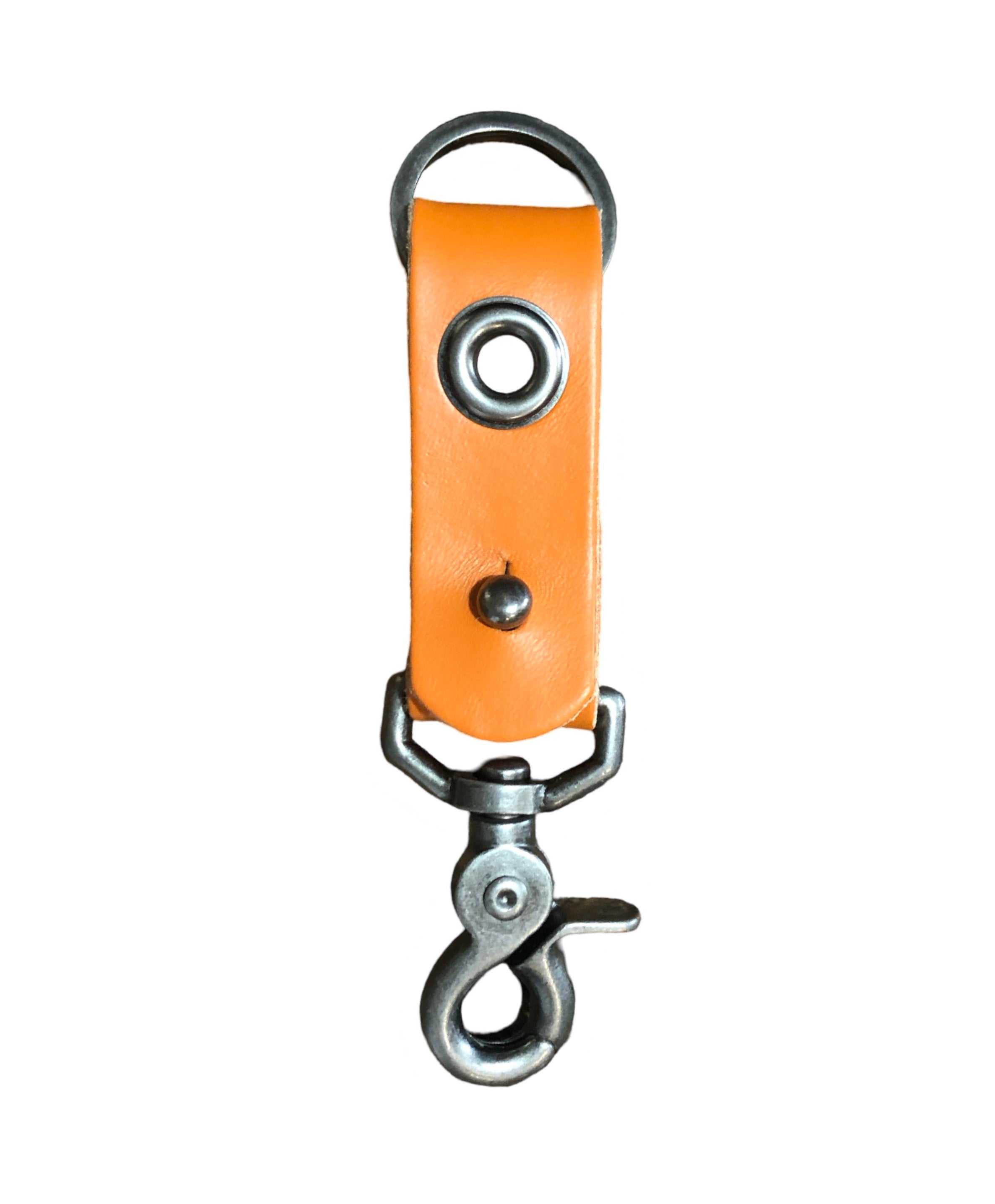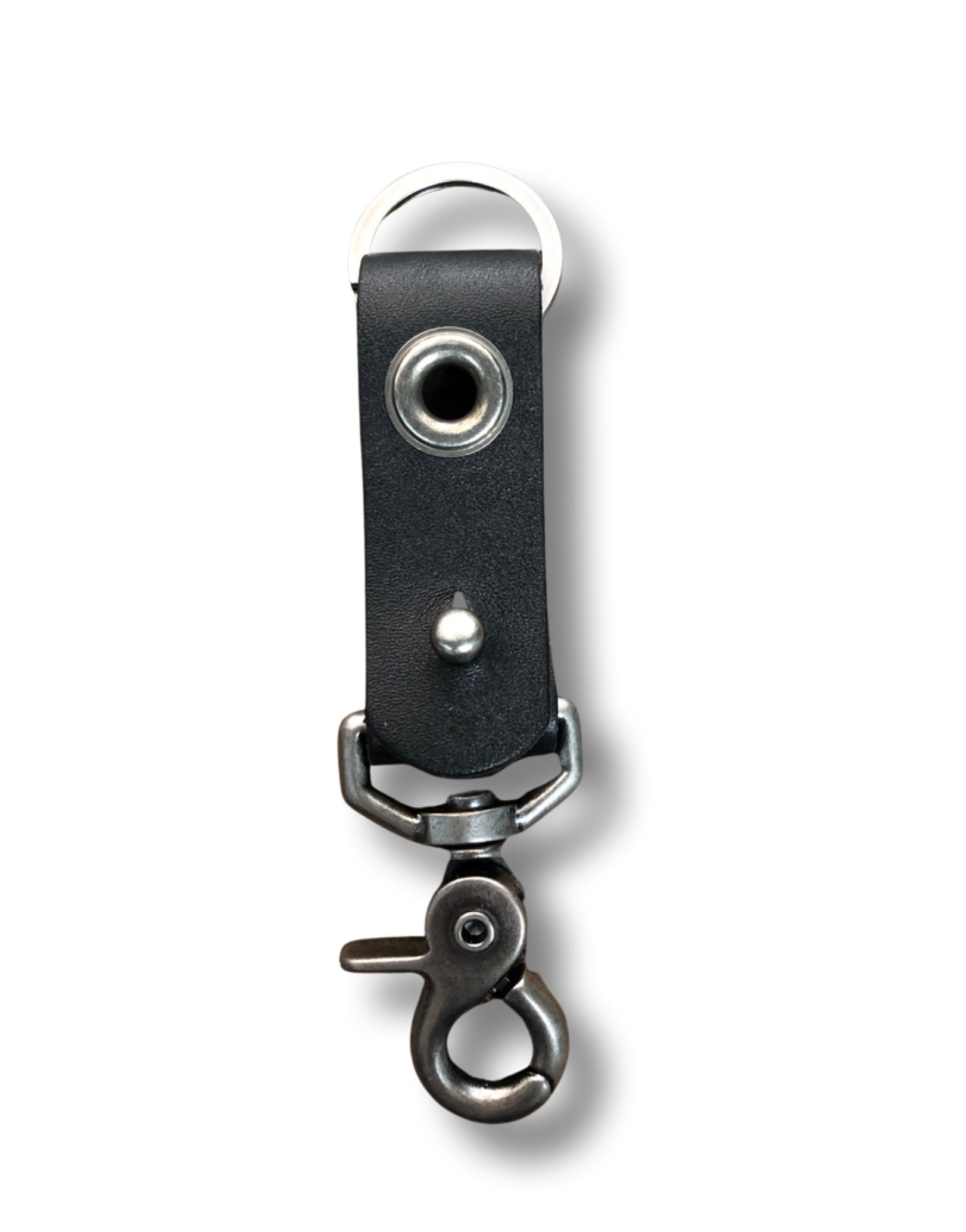 1” wide leather band with 5/8” grommet and pewter clip and key ring.